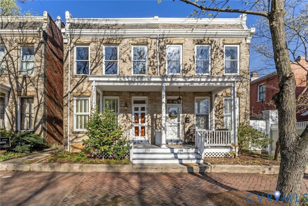 Step into Richmond's storied past with this captivating brick home, completed by 1907 and located just one block from Libby Park in the heart of historic Church Hill. The full front porch is exactly what this neighborhood is known for - a welcoming place to sit, relax, and greet neighbors as they pass on their way to the park. Inside, historic character and thoughtful renovations come together seamlessly. Heart of pine floors run throughout, complemented by wide window sills and substantial moldings, including custom crown molding in the living and dining rooms. The first floor offers an open yet well-defined layout with a spacious living room flowing into a generous dining area. French doors with a webbed transom add architectural detail and natural light as they lead into the renovated kitchen. The kitchen is well-designed and highly functional, featuring natural maple 42-inch cabinetry, granite countertops, and generous storage. A first-floor powder room is tucked discreetly off the main living space. Upstairs, the primary bedroom includes a large walk-in closet - a rare feature for a home of this era. The second bedroom is equally spacious and opens to a rear balcony overlooking the private backyard. A full bath and central hall complete the second level. Out back, an easy-care private garden with a brick patio provides a peaceful setting for entertaining or quiet evenings at home. This house is listed as a contributing structure to the St. John's Church Historic District on the Virginia Landmarks Register and the National Register of Historic Places. Fire in the fireplaces has been digitally added to the photos.