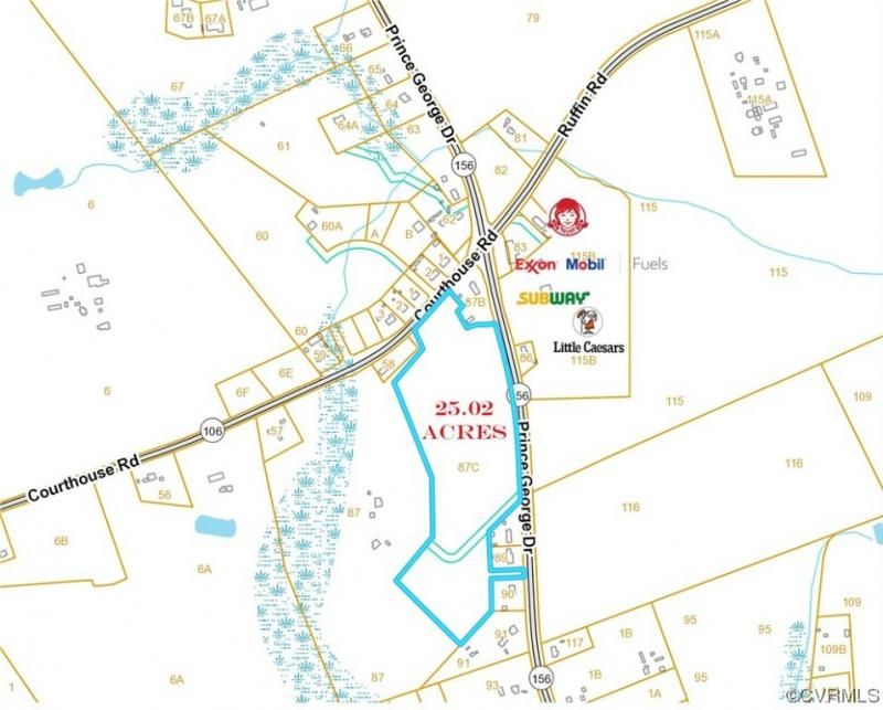 25 acres with road frontage on Prince George Drive AND Courthouse Road. Great commercial potential.